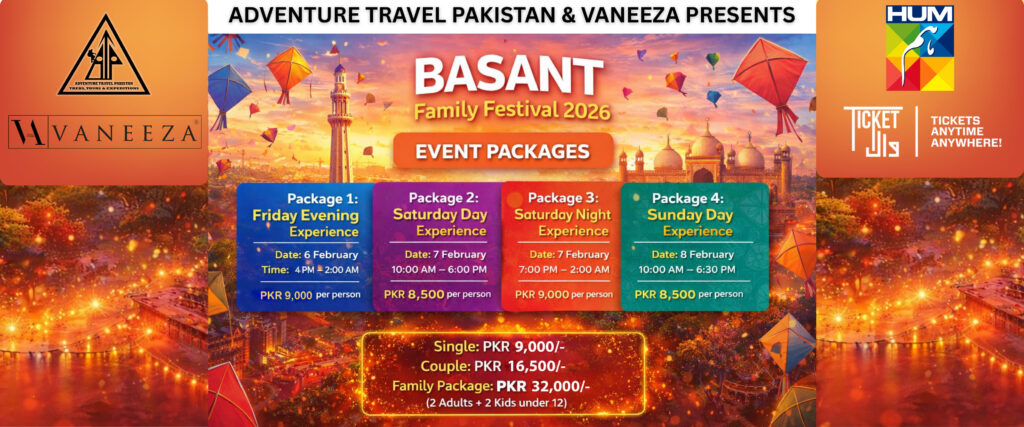 The Adventure Travel Pakistan Basant Event in Lahore takes place from 6–8 February 2026, offering a lively mix of kite flying, cultural performances, traditional music and adventure-themed experiences in a safe and eco-friendly setting. Visitors can enjoy guided tours, photography walks and local food tastings alongside free kites and dor, rooftop views near Data Darbar, and complimentary food and water. With sessions running across Friday evening, Saturday day and night, and Sunday daytime, the festival welcomes all ages, provides parking and wheelchair access, operates mainly as a standing event, restricts outside food, and allows smoking only in designated areas — making it one of the most unique Basant celebrations in Lahore this season.